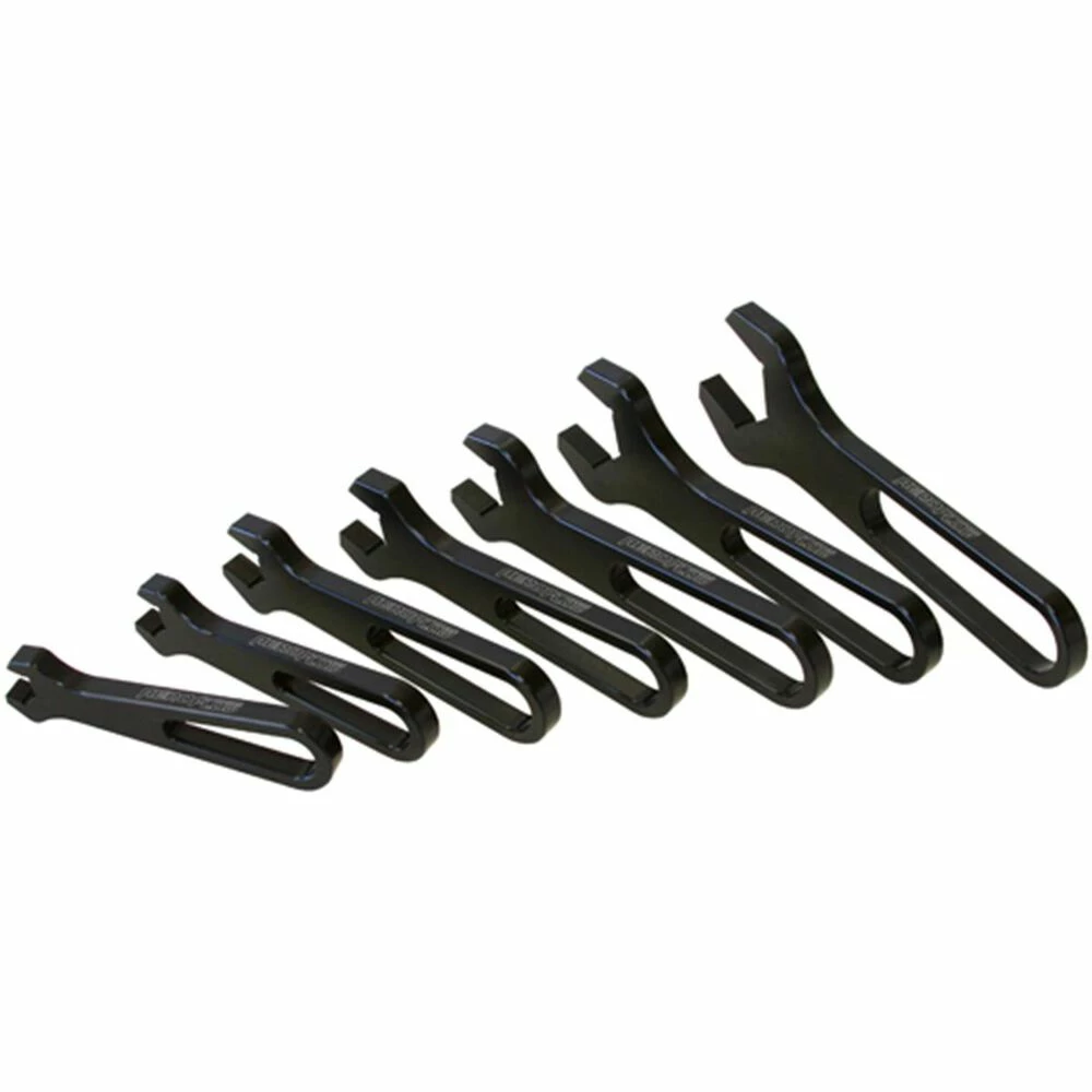 AN Fitting Wrenches provide a perfect fit so they won’t mark your fittings. All of these aluminium wrenches are colour code anodised and size stamped. Includes 7 sizes from -3AN to -16AN.