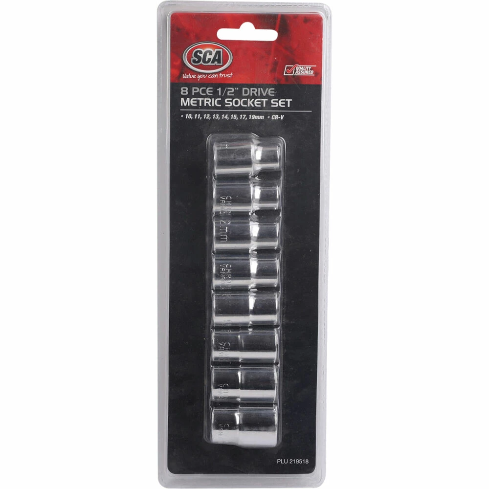 After a quality set of sockets but don’t want to spend large money? Have a large set already but missing those one or two sockets? Then this 8 Piece SCA Socket Set is ideal for you. Containing the most commonly used metric sizes, these 1/2″ drive sockets are made from durable chrome vanadium steel (Cr-V) for added strength and finished in an easy to clean high polish chrome finish. This particular socket set includes sizes: 10, 11, 12, 13, 14, 15, 17 and 19mm to suit a wide range of household and automotive applications.