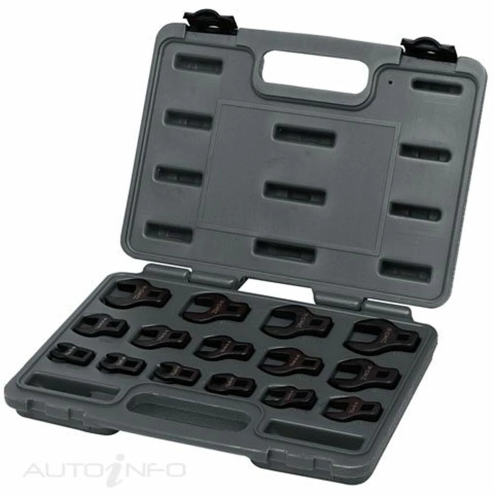 Straight jaw style crowfoot wrench set supplied in storage box. Metric set of 15 pieces with 3/8 inch square drive