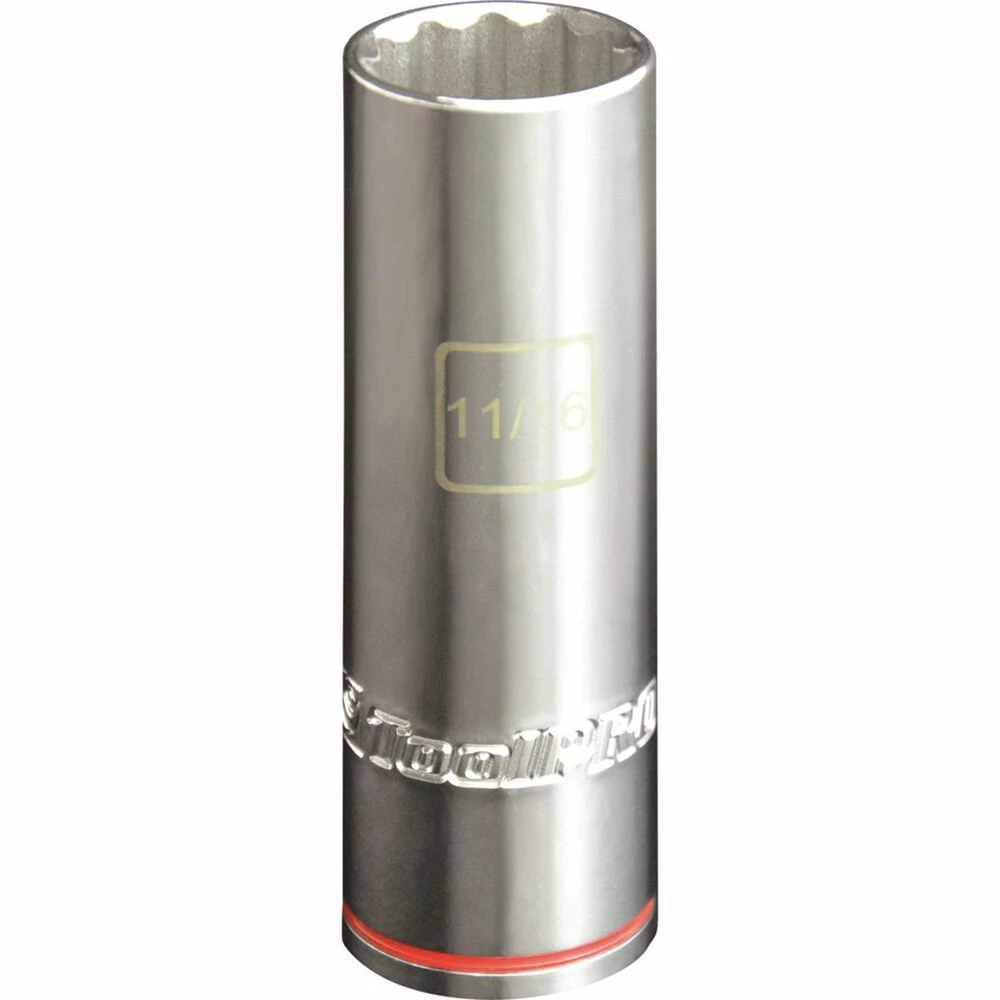 This 11/16″ single socket by ToolPRO is an ideal addition to any socket set. Made from high quality durable chrome vanadium steel and finished in a high polish easy to clean finish they are protected from corrosion and abrasion damage. The 12 point deep socket design allows for easy and damage-free reach on stud fasteners and electronic sensors commonly found in engine bays. This socket is suitable for 1/2″ drive ratchets and breaker bars but is not suitable for impact applications. Each socket features a colour coded band to signify whether it’s metric or SAE and is backed by Supercheap Auto’s amazing lifetime warranty.