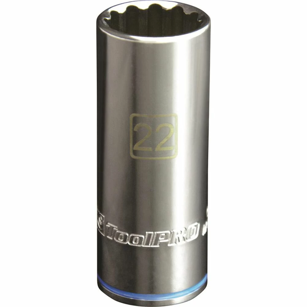 This 22mm single socket by ToolPRO is an ideal addition to any socket set. Made from high quality durable chrome vanadium steel and finished in a high polish easy to clean finish they are protected from corrosion and abrasion damage. The 12 point deep socket design allows for easy and damage-free reach on stud fasteners and electronic sensors commonly found in engine bays. This socket is suitable for 1/2″ drive ratchets and breaker bars but is not suitable for impact applications. Each socket features a colour coded band to signify whether it’s metric or SAE and is backed by Supercheap Auto’s amazing lifetime warranty.