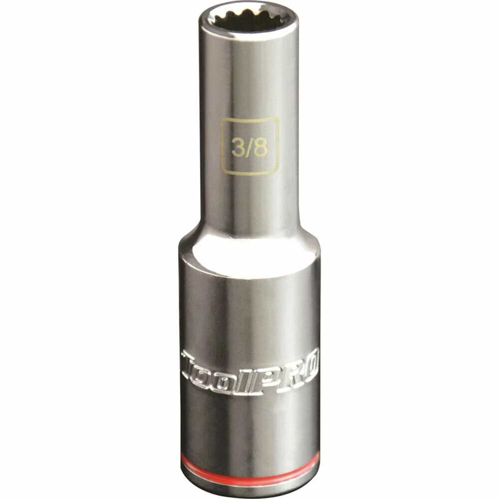 This 3/8″ single socket by ToolPRO is an ideal addition to any socket set. Made from high quality durable chrome vanadium steel and finished in a high polish easy to clean finish they are protected from corrosion and abrasion damage. The 12 point deep socket design allows for easy and damage-free reach on stud fasteners and electronic sensors commonly found in engine bays. This socket is suitable for 1/2″ drive ratchets and breaker bars but is not suitable for impact applications. Each socket features a colour coded band to signify whether it’s metric or SAE and is backed by Supercheap Auto’s amazing lifetime warranty.