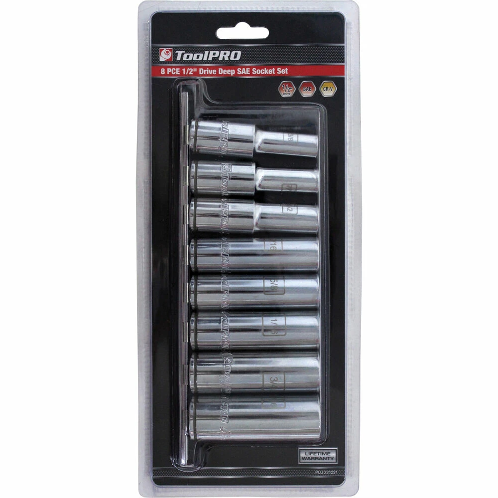 After a quality set of sockets but don’t want to spend large money? Have a large set already but missing those one or two sockets? Then this 8 Piece ToolPRO Socket Set is ideal for you. Containing the most commonly used imperial sizes, these 1/2″ drive sockets are made from durable chrome vanadium steel (Cr-V) for added strength and finished in an easy to clean high polish chrome finish. The deep socket design allows easy access to deeply recessed fasteners or stud style fasteners commonly found in engine bays. This particular socket set includes sizes 3/8, 7/16, 1/2, 9/16, 5/8, 11/16, 3/4 and 13/16″ to suit a wide range of household and automotive applications.