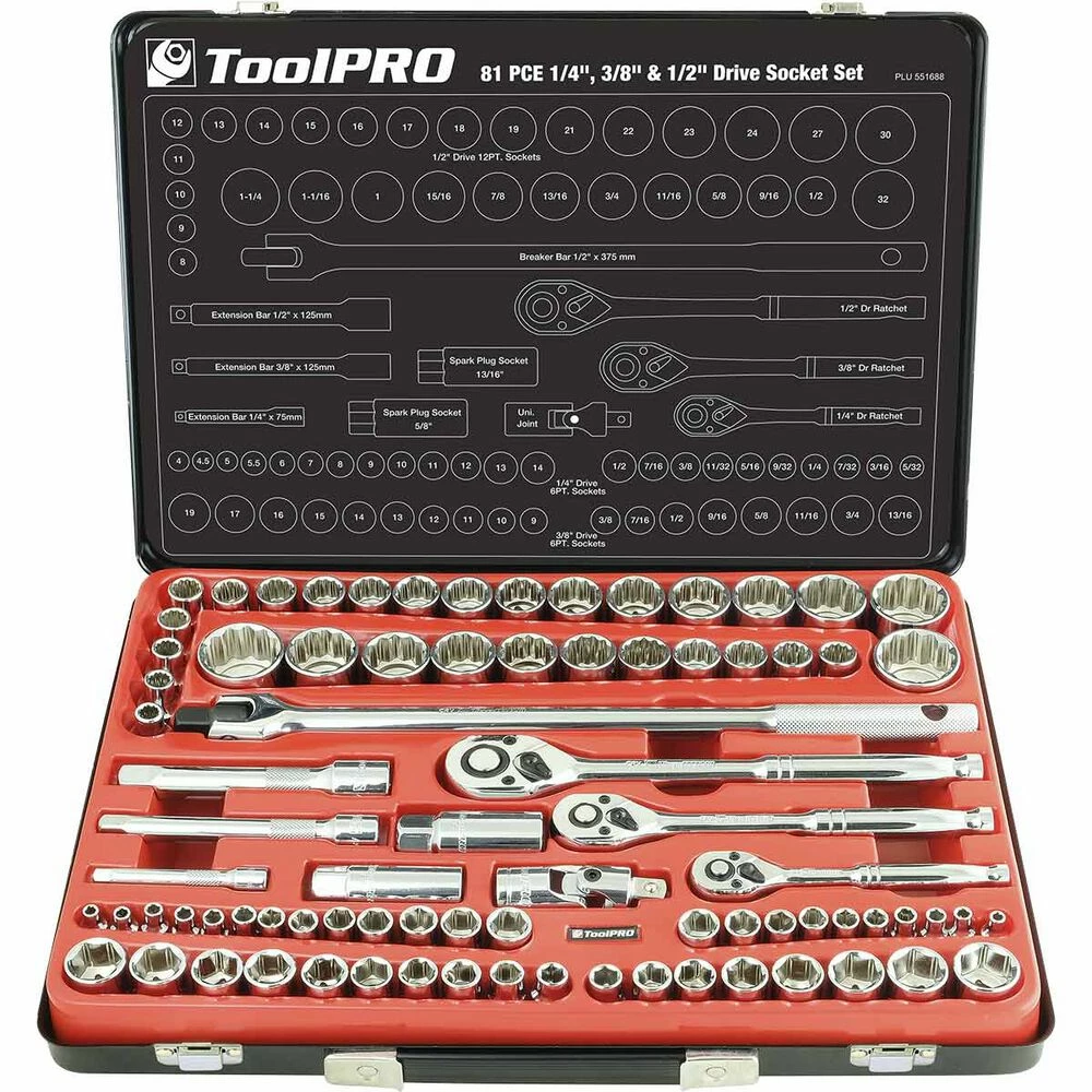 The ToolPRO 1/4, 3/8 and 1/2″ Drive Socket set is a fantastic starter kit designed for almost all size fasteners typically found in light automotive applications. Manufactured from chrome plated carbon steel and plated with high polish chrome for improved corrosion and abrasion resistance these tools will last and last. All housed in a black powder coated steel tin and organised by means of a plastic moulded tray you’ll always have the right size socket at your finger tips in a pinch. The reversible ratchet provides both tightening and loosening capabilities and features a contoured handle for improved grip. If you like to spend your time tinkering with cars, grab this ToolPRO 1/4, 3/8 and 1/2″ Socket Set today.