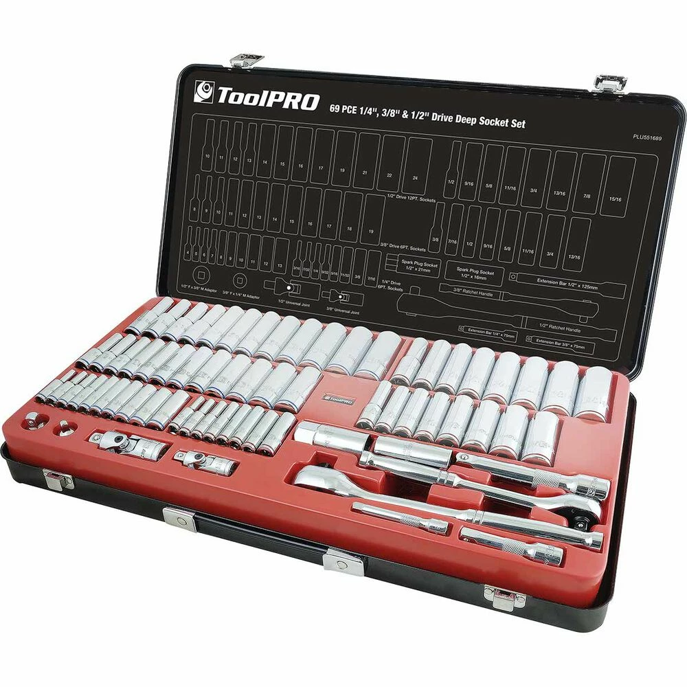 The ToolPRO 3/8 and 1/2″ Drive Socket set is a fantastic starter kit designed for almost all size fasteners typically found in light automotive applications. Manufactured from durable chrome vanadium steel with a high polish finish for improved corrosion and abrasion resistance these tools will last and last.