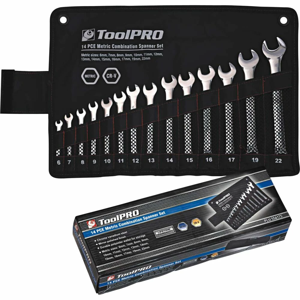 ToolPRO Spanners meet and exceed both DIN and ANSI standards, so you can be sure that they are sturdy enough to tackle any job you need done. And if that wasnβt enough, each spanner comes with a lifetime warranty giving you peace of mind over years of service in the workshop. Supplied in a water resistant nylon spanner roll with steel eyelets to hang on the wall to keep your spanners tidy and organised.